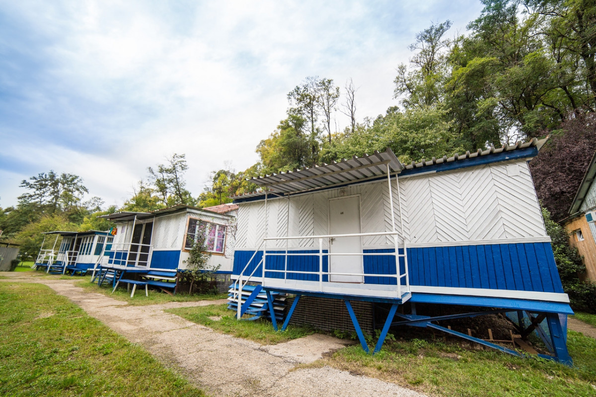 Домики деревянные, в которых дышится и спится легко, утром просыпаешься от пения птиц. На территории базы очень много зелени, что спасает днем от жары.